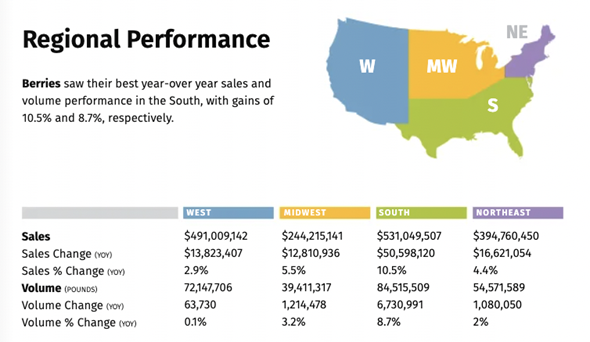 En cuanto a volúmenes, las bananas orgánicas ocuparon el primer lugar con 538 millones de libras vendidas, mientras que los berries ocuparon el segundo lugar con un volumen de 251 millones de libras.