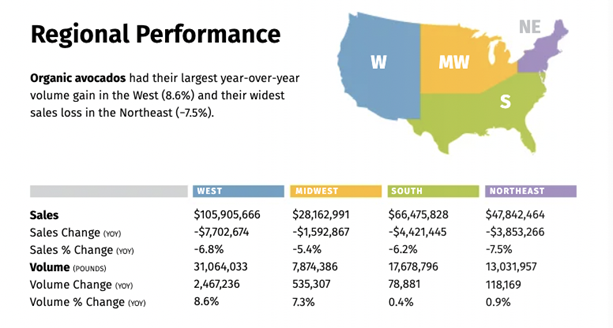 Las ventas de manzanas orgánicas sufrieron una caída interanual del -0.9% en 2023. La región Oeste del país fue la única que registró un aumento interanual en las ventas (+0.9%) en 2023, mientras que el Noreste y el Medio Oeste igualaron en la mayor pérdida de volumen (-4.1%).