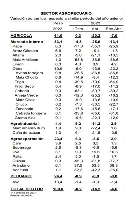 En abril, el sector agropecuario se contrajo -14.2% debido a una menor producción de productos andinos (papa, cebada, arveja, haba y forrajes). Esto en un contexto de sequía, hasta enero, y heladas, hasta mayo de 2023, que desalentó las siembras y redujo las cosechas en la Sierra.