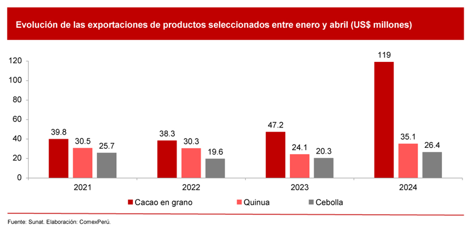 Las exportaciones peruanas de cacao en grano sumaron US$ 119 millones en los primeros cuatro meses del año, lo que significó un incremento de +152% con respecto al mismo periodo del año anterior. Cabe mencionar que, en 2023, los envíos de este producto al mundo crecieron un +23.2% con respecto a 2022. Asimismo, en lo que respecta al volumen exportado, este registró aumentos del 13.3% y el 28.8%, respectivamente.