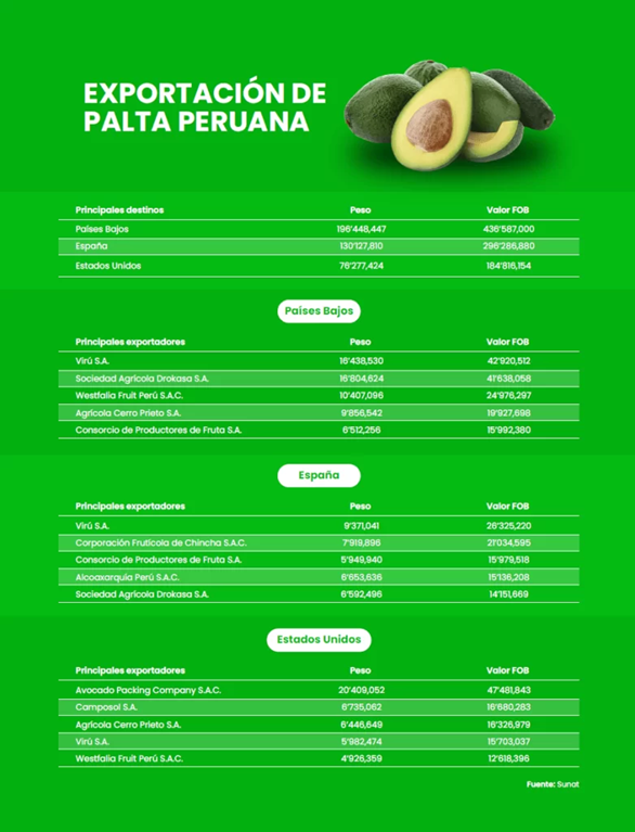 Europa sigue siendo el principal destino de la palta peruana. Solo en el 2024, se enviaron cerca de 403 mil toneladas por un valor de US$ 913 millones, lo que representó prácticamente el mismo volumen que el año anterior, pero con un crecimiento en valor de más del 38%. Esta priorización por el mercado europeo responde, en gran medida, a la alta valoración de la palta peruana en comparación con la de otros competidores, como México, que es el principal exportador global. Sin embargo, para el 2025, el panorama podría volverse más desafiante, especialmente en términos de precios, debido al crecimiento acelerado de Colombia en la mayoría de los mercados. En Europa, en particular, la fuerte presión de México en Estados Unidos ha llevado a Colombia a apostar por las mismas plazas clave que el Perú, con un crecimiento cercano al 17% en la campaña pasada.