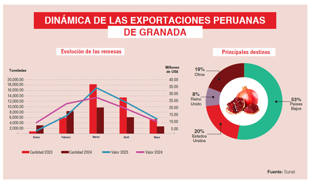 Sin embargo, la granada de origen peruano no ha logrado aprovechar esta ola del todo. Con una campaña que se concentra principalmente en la primera mitad del año, el fruto logró tener un despegue inicial y colarse entre los productos de mediana relevancia en la canasta agroexportadora peruana (puesto 15), junto a la cebolla y la quinua, pero de eso ya ha pasado un lustro.