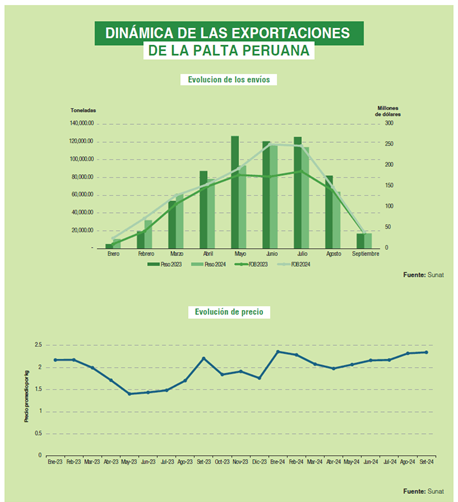 Hasta el fin de septiembre, en la actual campaña que está a punto de cerrar en octubre, se ha exportado cerca de 587.000 toneladas de palta fresca por un valor cercano a los US$ 1,260 millones. Esto significó una caída cercana al 9% en volumen, pero con un crecimiento de 23% en valor. El precio fue clave para que la campaña pudiera revertir de forma positiva la caída del volumen, obteniendo un promedio cercano a los US$ 2.15 por kilogramo, 34% mayor que en la campaña anterior. Con poco menos de un mes para que la campaña cierre en su totalidad y algunos envíos rezagados completen los envíos anuales, se espera que la campaña total cierre con 591 mil toneladas y US$ 1,270 millones en envíos de palta fresca.