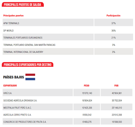 Durante la campaña actual, los principales exportadores fueron Virú S.A (7% de participación), Wesftalia S.A (6%) y Sociedad Agrícola Drokasa S.A. (6%). Con respecto a las principales regiones exportadoras, Lima lideró esta campaña con 33% de participación, seguido de la Libertad (27%) e Ica (21%).