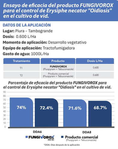 Para validar su desempeño, FUNGIVOROX fue sometido a rigurosos ensayos de eficacia en la zona de Tambogrande – Piura, enfocados en el control de “Oidiosis” en el cultivo de vid.