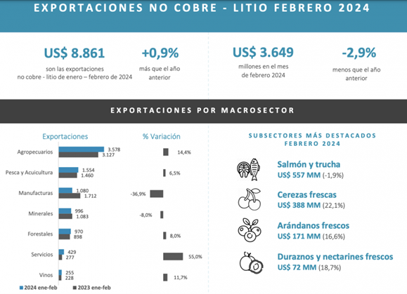. Si desea leer el informe completo de ProChile, siga el enlace: https://cdc.prochile.cl/wp-content/uploads/2024/03/Informe-Exportaciones-No-Cobre-No-Litio-febrero-2024-2.pdf