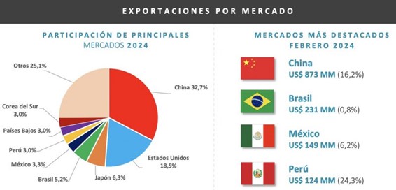 En términos de mercados, los más destacados entre enero y febrero fueron China (US$ 2.894 millones, +3,4%), Japón con US$ 557 millones (+7,6%), Brasil (US$ 459 millones, +10,4%) y México con US$ 292 millones (+0,9%).