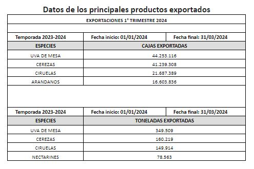 Los principales productos fueron la uva de mesa, las cerezas y las ciruelas, con los países de Lejano Oriente quienes acapararon el mayor volumen (70.182.794 cajas).