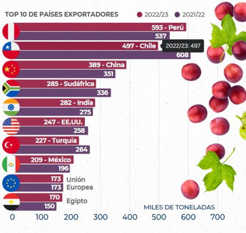 Aunque Perú domina las exportaciones, China sigue siendo el líder mundial en producción de uva, con 13.5 millones de toneladas en 2023, un incremento de 750.000 toneladas respecto al año previo. Este crecimiento se atribuye a mejoras tecnológicas y agrícolas.
