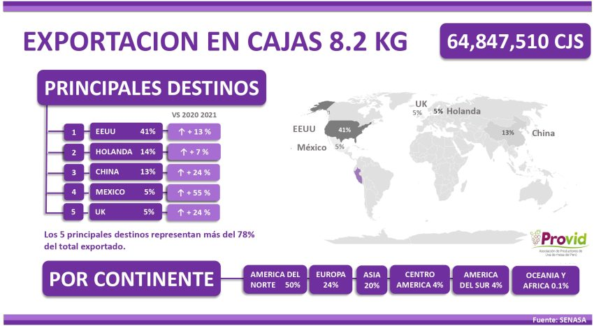 De acuerdo a cifras presentadas por el dirigente gremial a la semana 14 del año 2022, para la campaña de uva peruana el primer lugar sigue estando en Estados Unidos, con el 41% del volumen exportado, seguido de Holanda que significa el 14% y China con el 13%; ya de allí vienen México y Reino Unido, cada uno con 5% de participación.