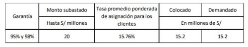En esta oportunidad, las entidades habilitadas y con línea disponible para participar que consiguieron asignación de garantías fueron: las cajas municipales Piura y Huancayo, así como la cooperativa de ahorro y crédito La Progresiva, a una tasa promedio de 15.76%, indicó.