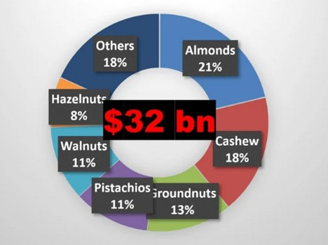 Yarmak indicó que, para analizar el mercado mundial de los frutos secos, deberíamos tener en cuenta no solo las nueces, las avellanas, las almendras y los pistachos, sino también esos frutos secos que, desde hace tiempo, son un nicho en nuestra región y aquellos que no son frutos secos en el sentido botánico pero que se refieren a frutos secos desde el punto de vista del consumidor. En concreto, los cacahuetes deben incluirse en el análisis del mercado de los frutos secos; son el principal competidor de otros frutos secos en los supermercados y en varios snacks.