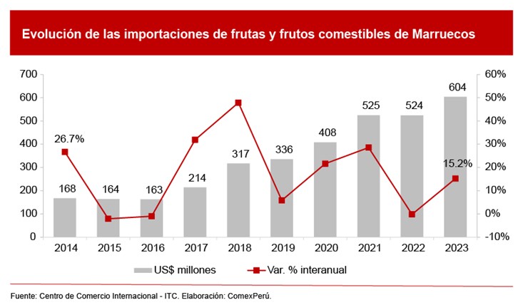 El gremio de comercio internacional señaló que entre 2014 y 2023, las exportaciones peruanas a Marruecos sumaron US$ 95 millones, según datos de la Sunat. Los envíos del sector no tradicional representaron el 99% de lo exportado a dicho destino, donde destacan los envíos del sector pesquero y agropecuario.