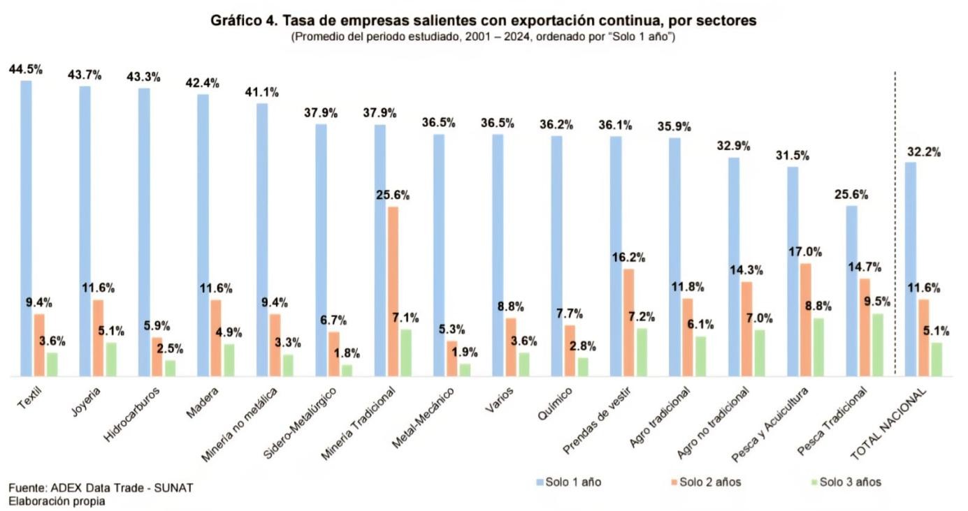 El documento detalla que, en promedio, el 75% de las compañías que exportan un solo producto a un único destino realizan envíos por apenas un año y dejaron de exportar al año siguiente, evidenciando la vulnerabilidad del sector y la urgencia de implementar estrategias que garanticen su permanencia. De la misma forma, entre el 2001 y 2024, alrededor del 50% que exportó entre uno y tres años consecutivos no volvió a hacerlo.