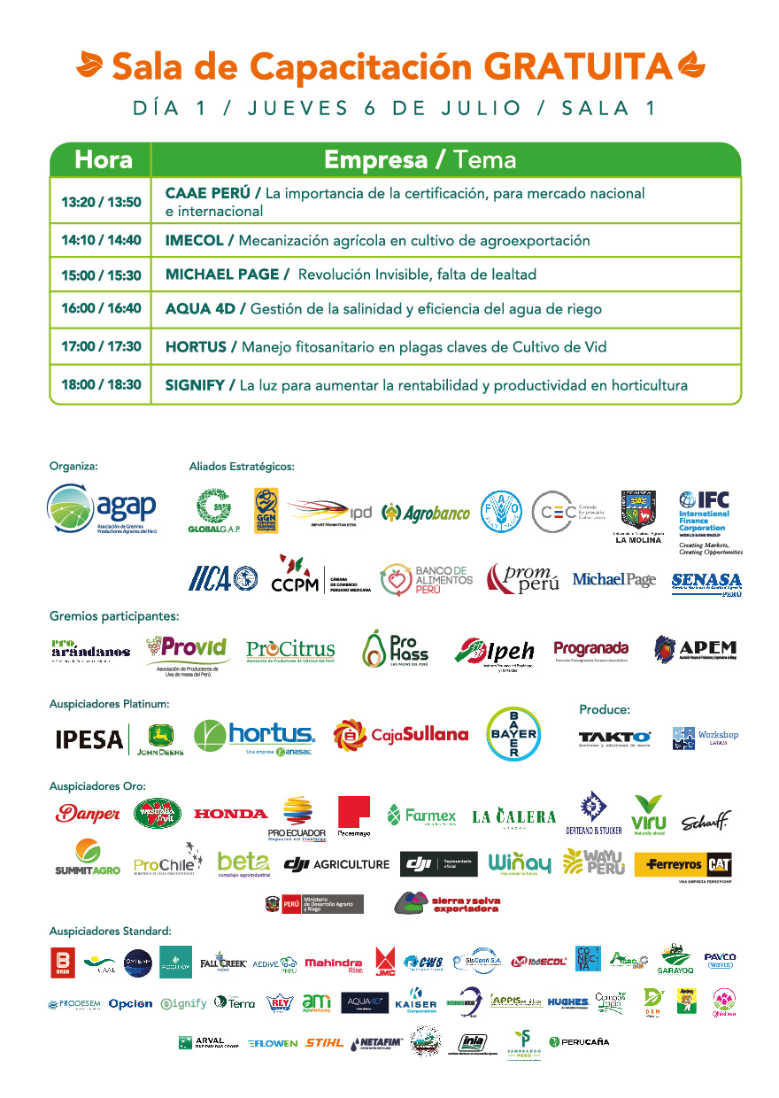 A lo largo de estas jornadas, que se desarrollan en Legado – Sede Videna del distrito limeño de San Luis, los asistentes tendrán la posibilidad de escuchar ponencias con líderes del sector agrícola, así como participar de capacitaciones gratuitas que ofrecen las marcas participantes del evento.