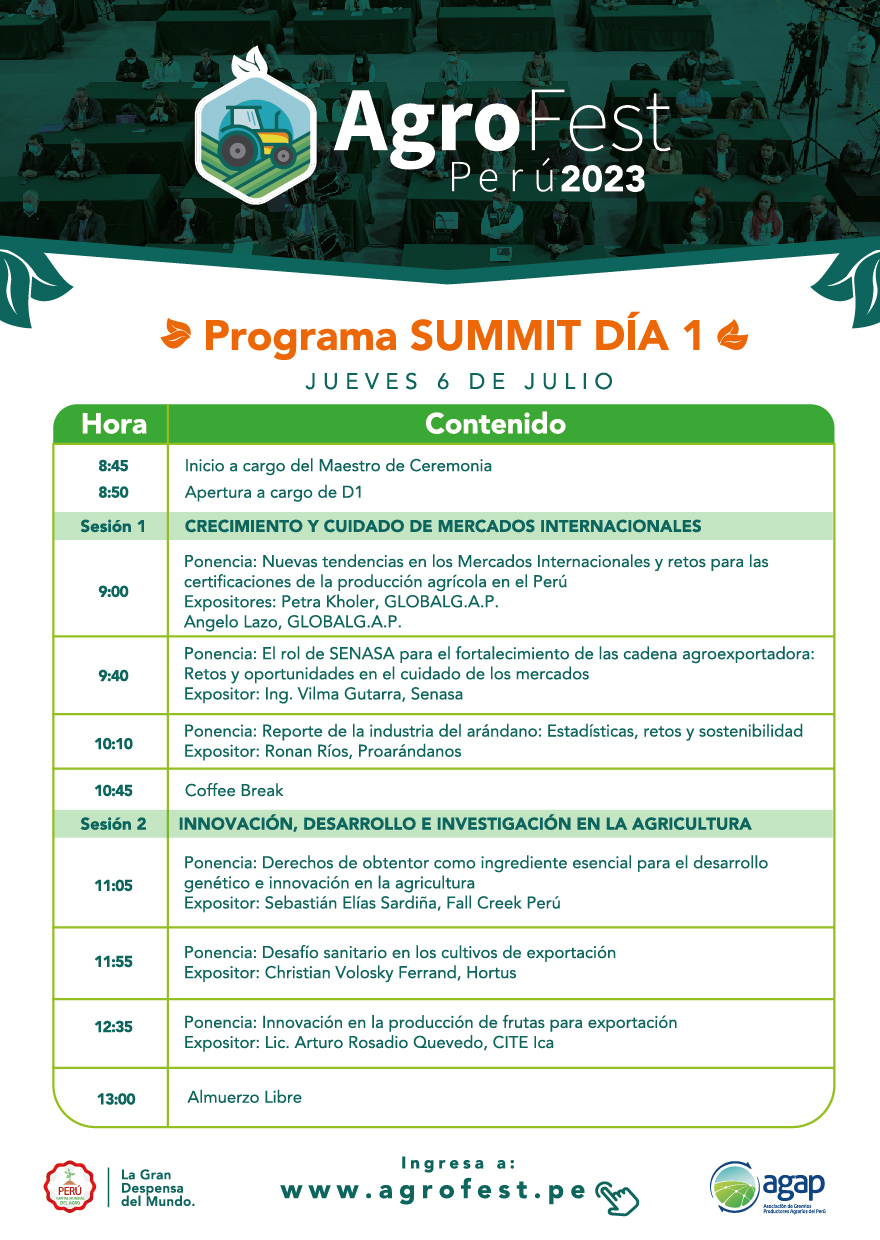 (Agraria.pe) El evento más importante de la agricultura moderna peruana, el “AGROFEST 2023”, se inicia hoy jueves 6 de julio con una nutrida agenda para el público especializado.