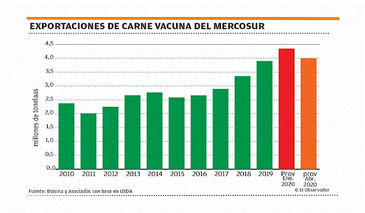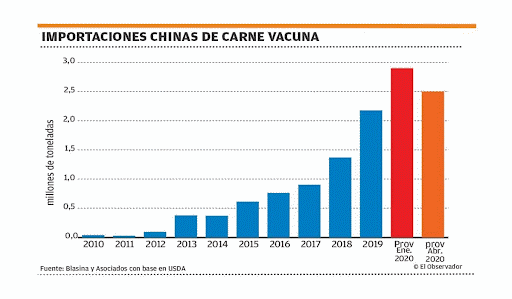 En 2019 los chinos consumieron 8.8 millones de toneladas de carne vacuna y para este año el Departamento de Agricultura de Estados Unidos (USDA) proyecta el consumo en 9.4 millones. Sí hay una corrección a la baja respecto a lo que se proyectaba en enero, 9.5 millones.