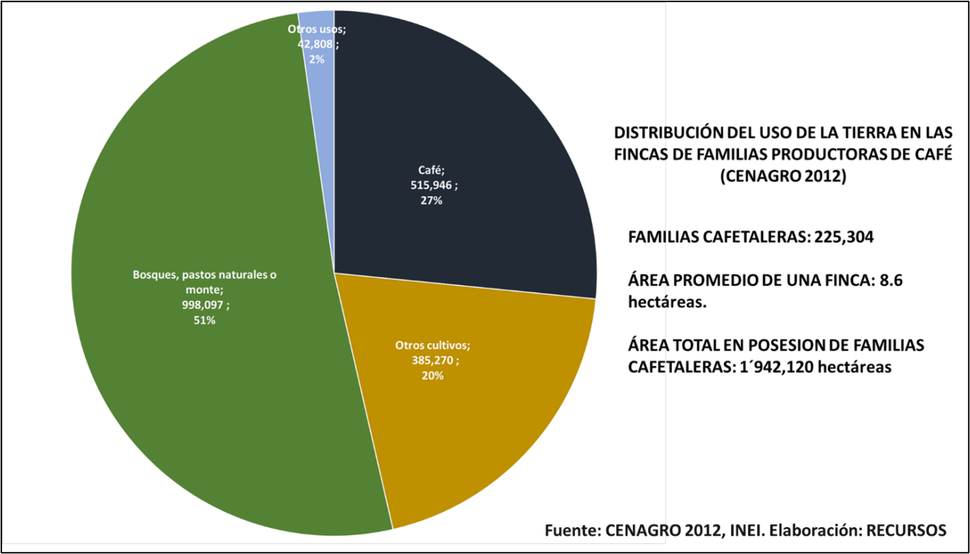En el caso del café, las fincas cafetaleras suman 225.304 y ocupaban un total de 1.9 millones de hectáreas. El área promedio por familia sembrada con café era de 2.3 hectáreas, otros cultivos 1.7 hectáreas y bosques, pastos o monte eran de 4.4 hectáreas. Multiplicando estos promedios por el número de fincas, tenemos que existirían 515.946 ha de café (27% del total), 385.269 de otros cultivos (20% del total) y 998.096 de bosque, pastos o monte (51% del total).