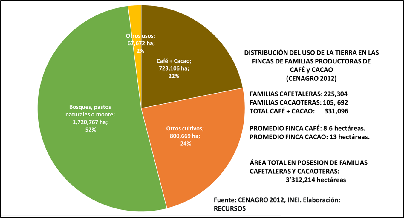 Sumando cacao y café tenemos un total de 331.096 fincas que ocupan un total de 3.3 millones de hectáreas, de las cuales el 52%, es decir, 1.7 millones de hectáreas son bosque; 723.106 hectáreas son cultivos de cacao y café, y 800.669 hectáreas otros cultivos.