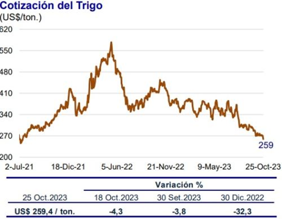 Entre el 18 y el 25 de octubre, el precio del trigo disminuyó 4.3% a 259.4 dólares la tonelada por la abundante cosecha de Rusia, la salida fluida de las exportaciones por el Mar Negro a través del nuevo corredor humanitario, así como por el ingreso de la cosecha de Brasil.