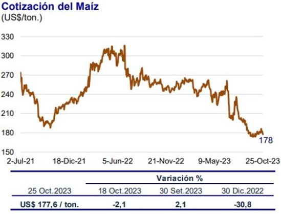Entre el 18 y el 25 de octubre el precio del maíz se redujo 2.1% a 177.6 dólares la tonelada por las mejores condiciones ambientales para los cultivos en la Argentina, el ingreso de la oferta de Estados Unidos y la caída del precio del petróleo.