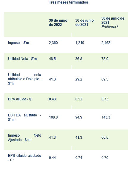 Carl McCann, presidente ejecutivo, expresó que: "Hace un año creamos Dole plc, líder mundial en productos frescos, tras la fusión de Total Produce y Dole Food Company. La mayor escala y diversificación de nuestro negocio verticalmente integrado nos ha permitido obtener unos resultados sólidos en el segundo trimestre de 2022, en línea con nuestras expectativas".