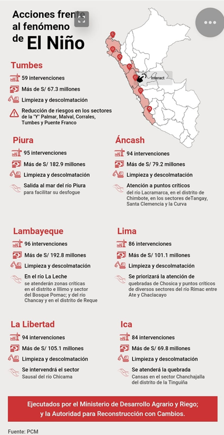 (Agraria.pe) El presidente del Consejo de Ministros, Alberto Otárola, anunció que el Gobierno tiene previsto invertir S/ 1446 millones para realizar 619 intervenciones de prevención en 7 regiones y compra de maquinaria, ante el fenómeno de El Niño.