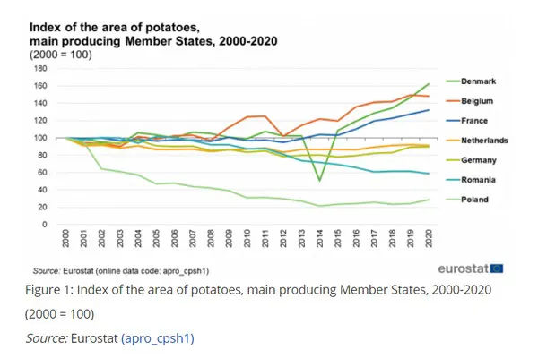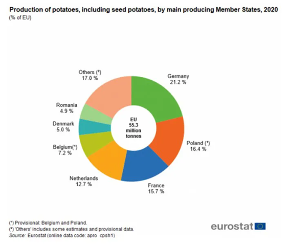 La producción cosechada de patatas en la UE fue de 55.3 millones de toneladas en 2020. Alemania fue el mayor productor de patatas de la UE en 2020 (con 11.7 millones de toneladas, el 21.2% del total de la UE), por delante de Polonia (un 16.4% provisional), Francia (15.7%) y los Países Bajos (12.7%).