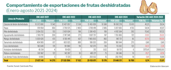 El crecimiento de la exportación de frutas deshidratadas peruanas es notable. En 2023 versus el 2022, las exportaciones de estos productos aumentaron un 11,19 % en valor y un 1,87 % en volumen, alcanzando los US$ 37 112 362 por 20 426 toneladas.