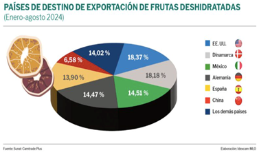 Estados Unidos fue principal país de destino de estos productos, con un 18,34 % de participación al comprar 479 toneladas de frutas deshidratadas por US$ 5 803 775 (+33,61 % en valor y +23,19 % en volumen). Los principales productos que compró fueron piñas, mangos, aguaymantos, plátanos y cáscaras de limón deshidratados.