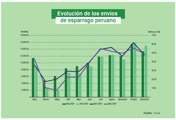 El mercado de exportación de espárragos en el 2024 no solo ha traído desafíos para el Perú, sino que también ha intensificado la competencia con México por el título de mayor exportador mundial de este producto. En los primeros once meses del presente año, el Perú acumuló envíos hacia Estados Unidos (principal destino para el Perú) por 65.127 toneladas y US$ 237 millones, lo que representó una caída del 7% en volumen y 5% en valor respecto del 2023. A pesar de esta contracción, el Perú se mantiene como el principal abastecedor de espárragos a nivel global, posición que ocupa desde el 2022 y que, con alta probabilidad, mantendrá al cierre de este año.