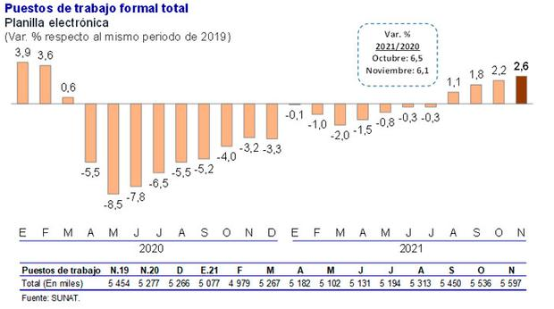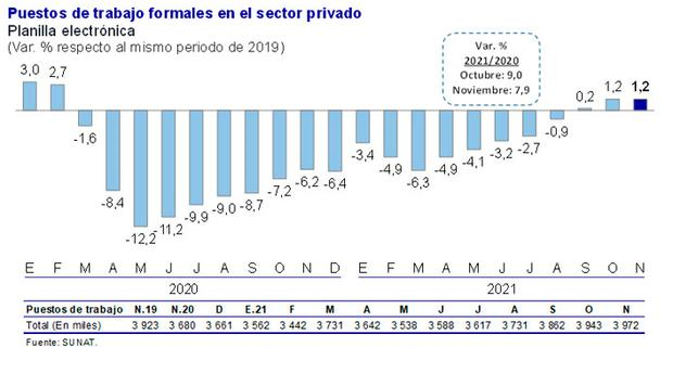 Según el BCR, el aumento de los puestos formales privados, en noviembre de 2021, fue de 1.2% con respecto a noviembre de 2019. Esto significó el tercer mes consecutivo con una tasa positiva desde el inicio de la pandemia.
