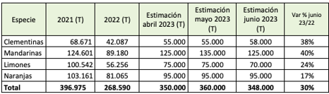 Las primeras estimaciones en abril de este año señalaban un volumen de exportación para clementinas de 55.000 toneladas, para mandarinas de 125.000 toneladas, para naranjas 95.000 toneladas y para limones 75.000 toneladas. En el mes de mayo, se actualizó el volumen de mandarinas a 135.000 toneladas. La última proyección indica un volumen de clementinas de 58.000 toneladas de exportación; mientras que los envíos para las mandarinas bajarían a 125.000 toneladas, se mantendría el volumen de naranjas; y los limones también irían a la baja con 70.000 toneladas.