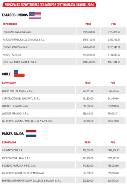 El principal destino del limón de origen peruano fue los Estados Unidos. Sin embargo, este mercado no se destacó por sus precios, debido a dos factores. El primero fue la presencia constante del limón mexicano que, a pesar de sus problemas de producción, pudo sostener su abastecimiento y el aumento de los envíos peruanos en más de 50%. Esto produjo que los costes en este destino se redujeran en casi 7%, a diferencia de la mayoría de las otras regiones donde no domina México y se vieron alzas en los precios.