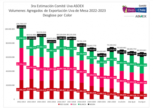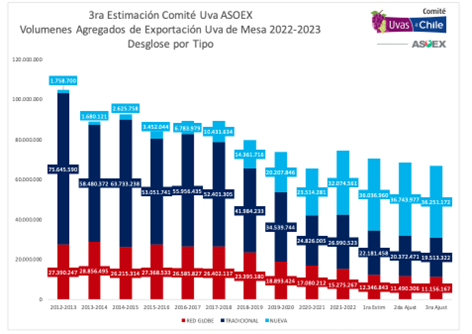 (Agraria.pe) El Comité de Uva de Mesa de la Asociación de Exportadores de Frutas de Chile A G (ASOEX) ha liberado una tercera previsión respecto a las exportaciones de esta fruta para esta temporada 2022-2023, donde sigue destacando el aumento de los envíos de variedades nuevas, tal como anunció en su segunda estimación.