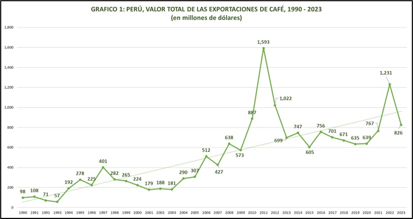 (Agraria.pe) Nadie puede negar el éxito comercial y social del café y cacao en el Perú. El año 1990 las exportaciones peruanas de café verde alcanzaron los US $ 98 millones mientras que el 2023 llegamos a registrar US $ 826 millones en las exportaciones de este producto, un crecimiento del 7% anual en los últimos 33 años. Un éxito. El caso del cacao es aún más espectacular: el año 1990 se exportó solamente US $ 5 millones de cacao y derivados, mientras que el 2023 alcanzamos una cifra récord de US $ 406 millones, lo que nos da una tasa anual de crecimiento del 15% en el mismo período. Los dos gráficos aquí abajo nos muestran este espectacular éxito comercial.