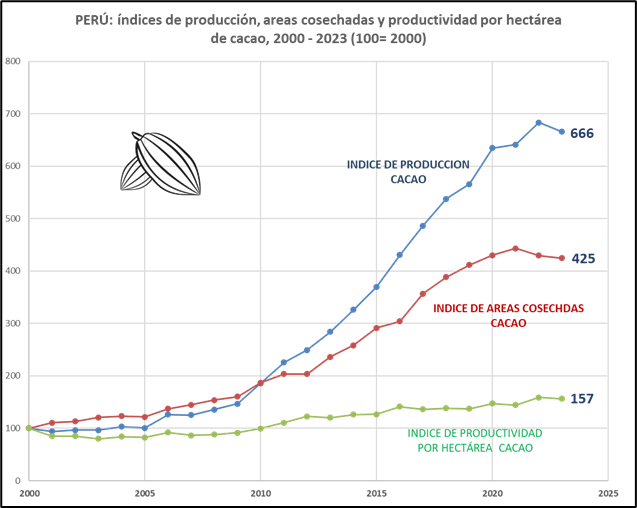 Cuando mostramos en un solo gráfico los índices de producción, áreas sembradas y productividad por hectárea del cacao, es fácil visualizar que el aumento de producción es sostenido principalmente por el aumento de áreas cosechadas antes que por la productividad. El en gráfico 3, observamos que mientras que el índice de producción, tomando el año 2000 como base (año 2000= 100), se multiplicó por 6.7 veces y el índice de áreas cosechadas por 4.3 veces, el índice de productividad sólo se multiplicó sólo 1.6 veces, todo esto entre los años 2000 al 2023.