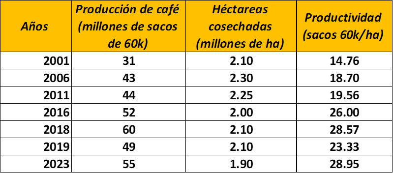 CUADRO 1. BRASIL: PRODUCCIÓN, HECTÁREAS COSECHADAS Y PRODUCTIVIDAD DE CAFÉ (2001 -2023)