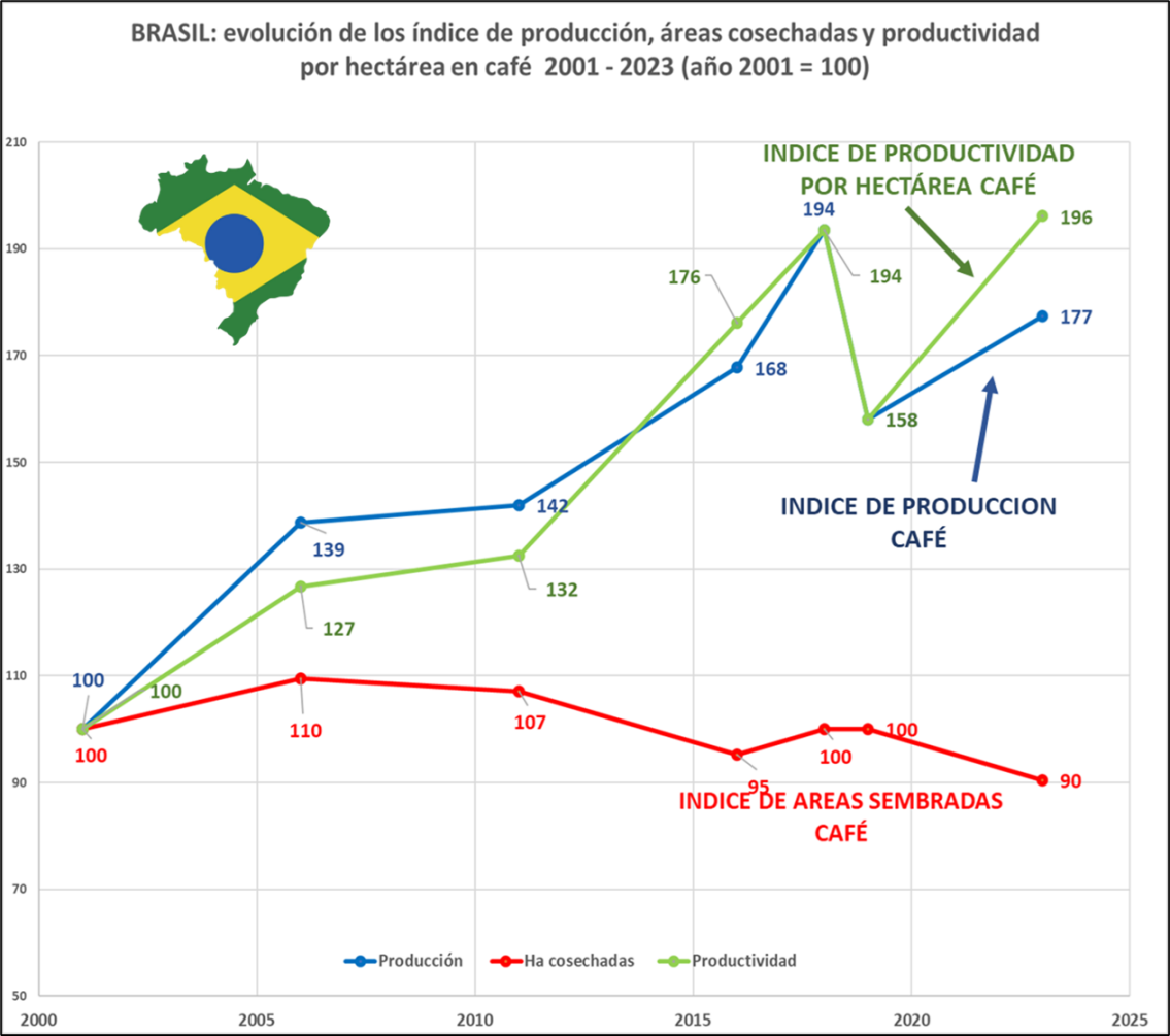 GRAFICO 5. BRASIL, INDICES DE PRODUCCION, AREAS COSECHADAS Y PRODUCTIVIDAD POR HECTÁREA EN CAFÉ, 2001 – 2023 (100 = año 2001)