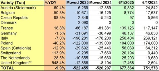 Los descensos interanuales más significativos se observaron en Polonia (-122.000 toneladas o -40.2%), Italia (-198.281 toneladas o -7.0%) y Francia (-86.187 toneladas a pesar de un incremento porcentual interanual de +18.8%, debido a un mayor movimiento en 2025). Austria, Bélgica y la República Checa también experimentaron fuertes reducciones en sus volúmenes de existencias, con Austria cayendo -60.4% y República Checa -98.3%.