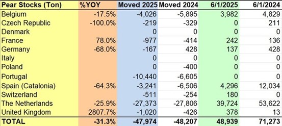 Las existencias europeas de peras se situaron en 48.939 toneladas el 1 de junio de 2025, lo que supone un descenso -31.3% respecto a las 71.273 toneladas registradas en la misma fecha de 2024. Se registraron importantes reducciones interanuales en España (Cataluña), donde las existencias bajaron de 12.034 a 4.296 toneladas (un descenso de -64.3%), y en los Países Bajos, donde disminuyeron en 13.898 toneladas hasta 39.724 toneladas, un descenso de -25.9%. Alemania también registró un fuerte descenso de -68%, con unas existencias que pasaron de 428 toneladas en 2024 a 137 toneladas en 2025.
