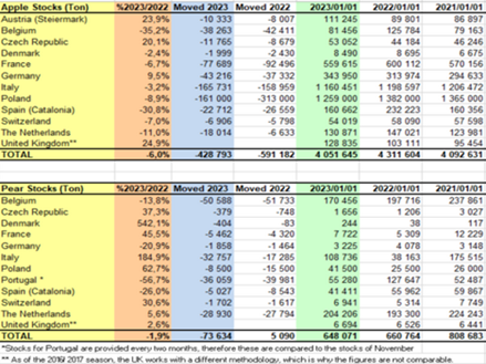 En cuanto a las peras, el descenso del 19% en la UE se debió a la reducción de las variedades Conferencia (-3,1%), Rocha (-56,7%) y Alejandrina (-20,4%). La Abate Fetel creció sustancialmente un 411%. Las existencias de Rocha portuguesa se comparan con las existencias del 1 de noviembre.