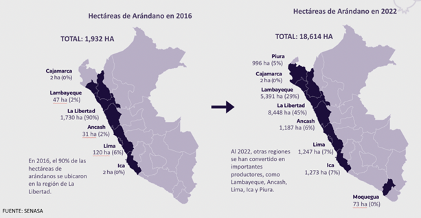 Según datos proporcionados por el Servicio Nacional de Sanidad Agraria (Senasa), en 2016, Perú sólo tenía 1.923 hectáreas arándano plantadas. Para 2020, ese número había crecido a 18.614.