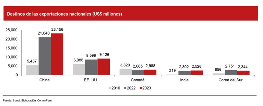 Asimismo, es importante resaltar que, luego del TLC, China se convirtió en el principal destino de las exportaciones peruanas . En 2010, las exportaciones sumaron US$ 5,437 millones y se cuadriplicaron para 2023. El primer lugar de China en el ranking de países se ha mantenido por los últimos años y la diferencia entre las exportaciones de los otros países es amplia.