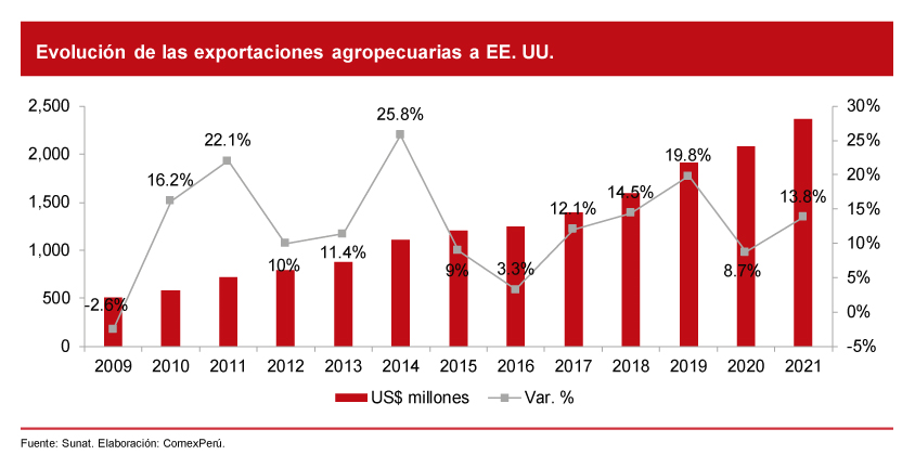 “En 2021, el beneficio de la apertura comercial con Estados Unidos se reflejó especialmente en nuestros envíos no tradicionales, que representaron un 67.5% del total exportado en el período enero-noviembre del 2021, con un valor de US$ 4.297 millones. Es importante considerar que este valor es un 27.1% y un 24.7% mayor que lo exportado en enero-noviembre de 2020 y 2019, respectivamente. Esto demuestra la fortaleza del sector y el importante mercado que representa”, sostuvo.