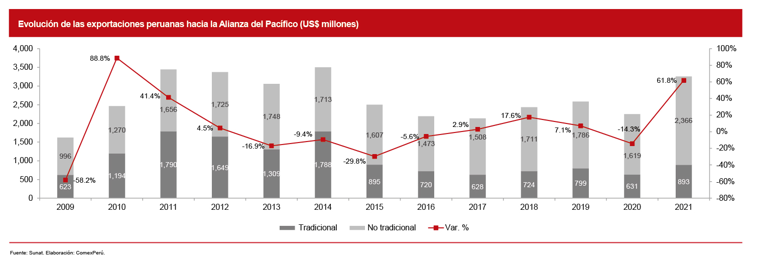 De acuerdo con cifras de la Superintendencia Nacional de Aduanas y de Administración Tributaria (Sunat), en 2021 las exportaciones peruanas al bloque sumaron un total de US$ 3.259 millones, su mejor resultado en 7 años. Esto representó una variación positiva del +44.9% con respecto a lo registrado en 2020. Este resultado obedece a los mayores envíos de nuestros productos tradicionales (+41.6%) y no tradicionales (+46.2%).