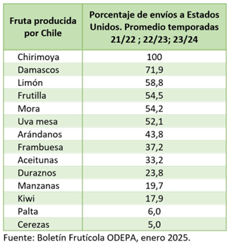 Cabe mencionar que la participación de Estados Unidos es relevante en la mayoría de las especies frutícolas que Chile exporta a ese mercado. Incluso, en algunas especies, como la chirimoya, el 100% de los envíos van a ese mercado y un número no menor exporta, al menos, el 50% de su volumen a ese destino (limón, frutilla, uva de mesa, arándano, mora).
