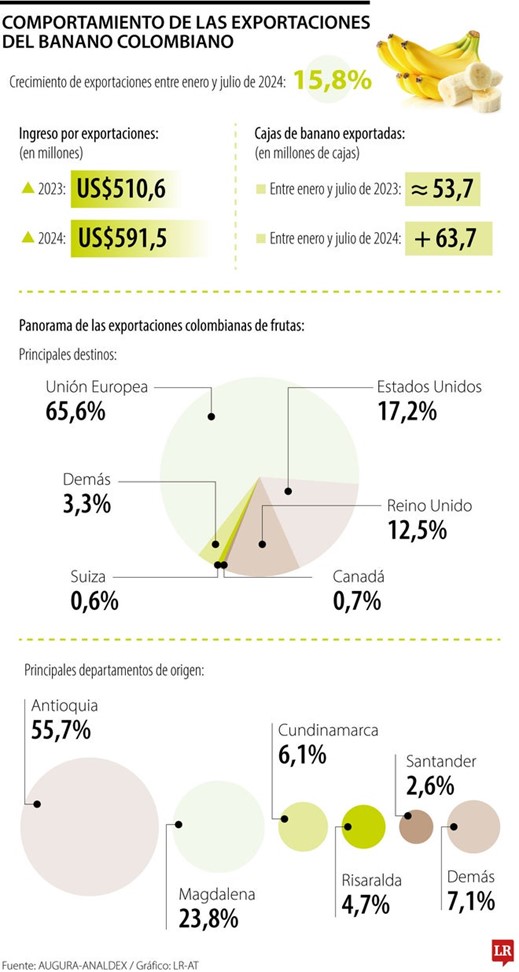 El ingreso por estas exportaciones pasó de US$510,6 millones reprortados entre enero y julio del 2023 a US$ 591,5 millones en los mismos meses de 2024, reflejando un aumento que refuerza la importancia del banano en la economía colombiana, especialmente en las regiones productoras como Urabá y Magdalena.