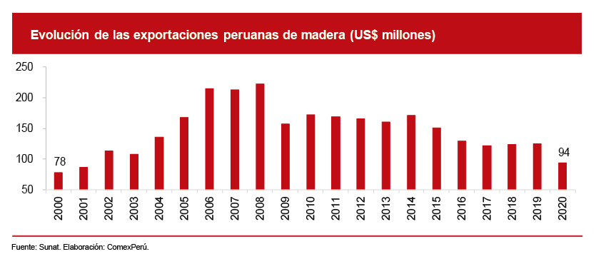 (Agraria.pe) Las exportaciones peruanas de madera pasaron de US$ 78 millones a US$ 94 millones entre 2000 y 2020, lo que representa un crecimiento promedio anual del 0.9%, según cifras de la Sunat.
