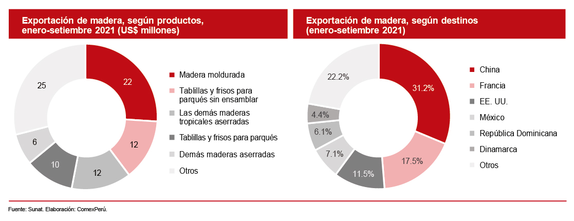 Con relación a 2021, al tercer trimestre, las exportaciones de maderas sumaron un valor de US$ 86 millones, un 34.5% más con respecto al mismo periodo de 2020. En particular, los mayores envíos fueron las maderas molduradas (US$ 22 millones, +140.6%), las tablillas y los pisos para parqué sin ensamblar (US$ 12 millones, +4.2%) y las demás maderas tropicales (US$ 12 millones, +32.8%).